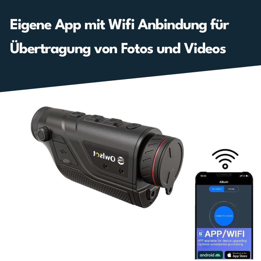 Wärmebild Monokular mit 400x300@12μm Detektor, 2,4-9,6x Digitalzoom und 0.4" FLCOS Vollfarbbildschirm mit 1280x960 Pixel. Ausserdem verfügt das Gerät um Wifi um das Handy zu verbinden für Foto oder Video Aufnahmen und einem Bild in Bild Modus.