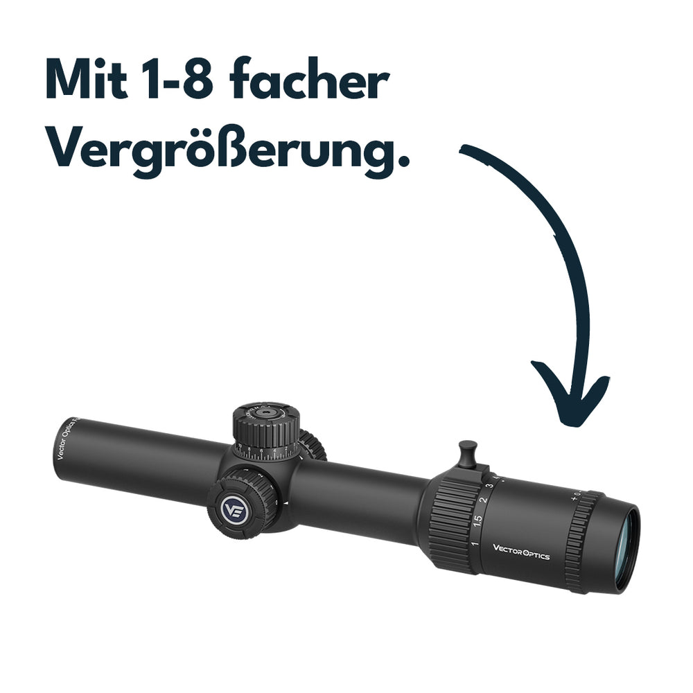 Dieses ZF wartet mit einem echten 1x Zoom für beidäugige Zielerfassung, einem 8x Zoom, einem Absehen mit beleuchtetem Mittelpunkt und Türmen mit Turret Lock System auf.