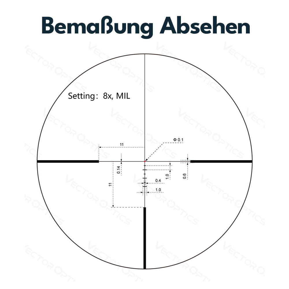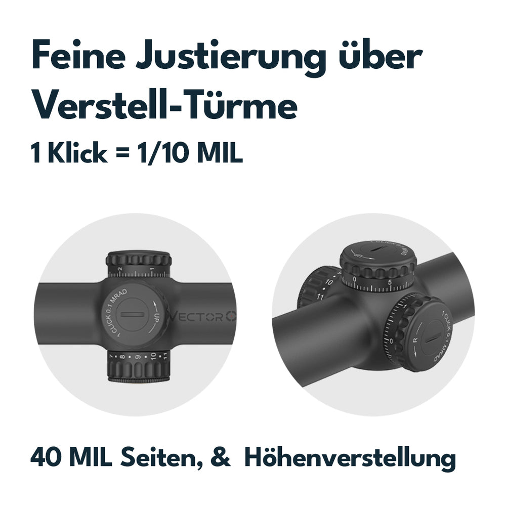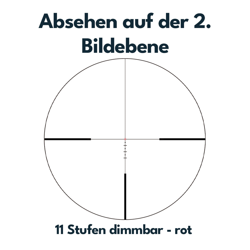 Zu den bemerkenswertesten Eigenschaften dieses Zielfernrohrs gehören das beleuchtete Absehen mit 6 Stufen welches der Umgebungshelligkeit angepasst werden kann um das Ziel schnell zu erfassen und die feine Verstellung in 1/10MIL Schritten. Dies ermöglicht eine bessere Sichtbarkeit des Absehens bei schlechten Lichtverhältnissen oder in der Dämmerung und eine feine Anpassung der Zielgenauigkeit um das Zielfernrohr optimal in Ihre individuellen Bedürfnisse und Schießbedingungen anzupassen.