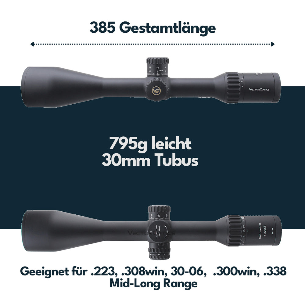 Die Vector Optics Continental Serie - unser Flaggschiff welches mit namhaften Optiken auf dem Markt mithalten kann und das zu einem unschlagbaren Preis für die gebotene Qualität. Deshalb, und da wir auch davon überzeugt sind, bieten wir auf alle Continental Modelle lebenslange Garantie! Das Zielfernrohr verfügt über hochwertige LaREE Linsen, die von der renommierten deutschen Firma Schott hergestellt werden. Diese Linsen bieten eine hervorragende optische Klarheit, hohe Lichtdurchlässigkeit und minimieren Verzerrungen, um ein gestochen scharfes Bild zu gewährleisten. Sie ermöglichen dem Benutzer eine präzise Zielerfassung und ein optimales Seherlebnis, selbst unter schwierigen Lichtverhältnissen. Zu den bemerkenswertesten Eigenschaften dieses Zielfernrohrs gehören das beleuchtete Absehen mit 6 Stufen welches der Umgebungshelligkeit angepasst werden kann um das Ziel schnell zu erfassen und die feine Verstellung in 1/10MIL Schritten. Dies ermöglicht eine bessere Sichtbarkeit des Absehens bei schlechten Lichtverhältnissen oder in der Dämmerung und eine feine Anpassung der Zielgenauigkeit um das Zielfernrohr optimal in Ihre individuellen Bedürfnisse und Schießbedingungen anzupassen. Zusammenfassend ist das Continental Zielfernrohr ein leistungsstarkes und zuverlässiges Optikprodukt, welches für Präzisionsschützen und Jäger entwickelt wurde. Mit seinen hochwertigen LaREE Linsen, dem beleuchteten Absehen und der präzisen Verstellung bietet es eine exzellente optische Leistung und ermöglicht eine genaue Zielerfassung über verschiedene Entfernungen.
