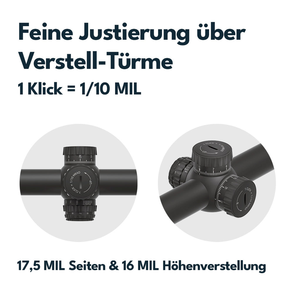 Die fein justierbaren und arretierbaren Verstelltürme mit 1 cm auf 100 m MRAD Klickverstellung machen es zum idealen Begleiter auch für anspruchsvolle Jagdsituationen oder auf dem Schießstand.