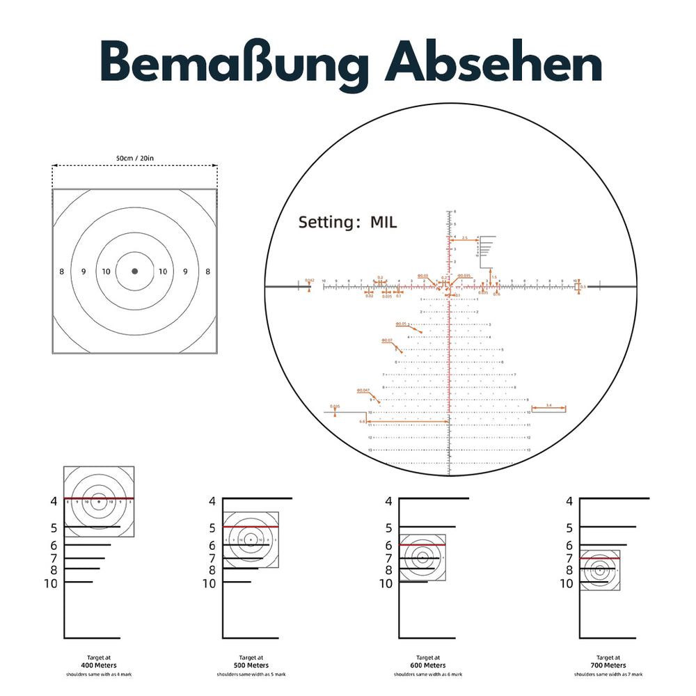Zu den bemerkenswertesten Eigenschaften dieses Zielfernrohrs gehören das beleuchtete Absehen mit 6 Stufen welches der Umgebungshelligkeit angepasst werden kann um das Ziel schnell zu erfassen und die feine Verstellung in 1/10MIL Schritten. Dies ermöglicht eine bessere Sichtbarkeit des Absehens bei schlechten Lichtverhältnissen oder in der Dämmerung und eine feine Anpassung der Zielgenauigkeit um das Zielfernrohr optimal in Ihre individuellen bedürfnisse und Schießbedingungen anzupassen.