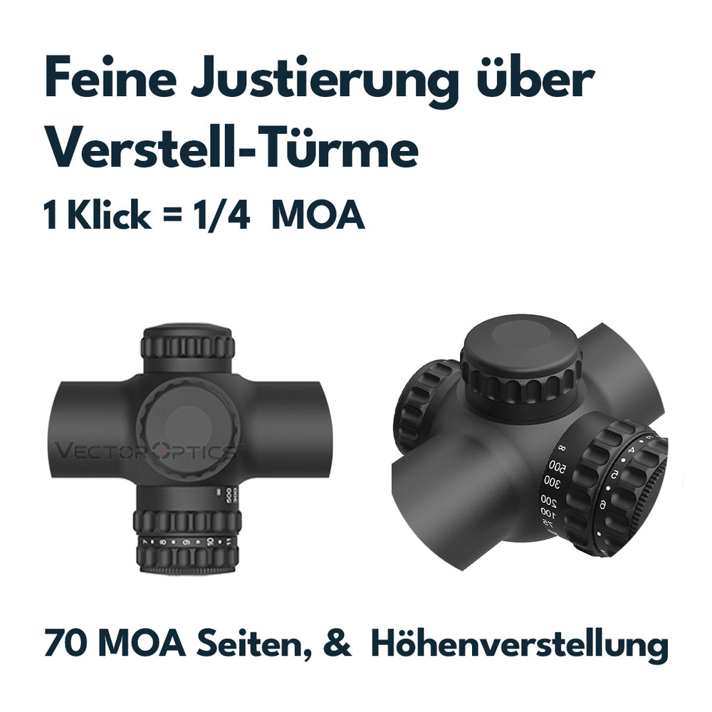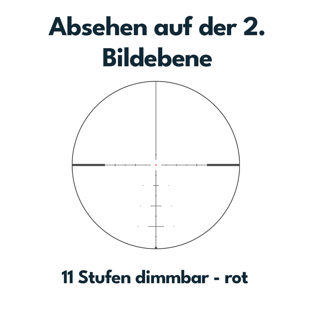 Zu den bemerkenswertesten Eigenschaften dieses Zielfernrohrs gehören das beleuchtete Absehen mit 6 Stufen welches der Umgebungshelligkeit angepasst werden kann um das Ziel schnell zu erfassen und die feine Verstellung in 1/10MIL Schritten. Dies ermöglicht eine bessere Sichtbarkeit des Absehens bei schlechten Lichtverhältnissen oder in der Dämmerung und eine feine Anpassung der Zielgenauigkeit um das Zielfernrohr optimal in Ihre individuellen Bedürfnisse und Schießbedingungen anzupassen.