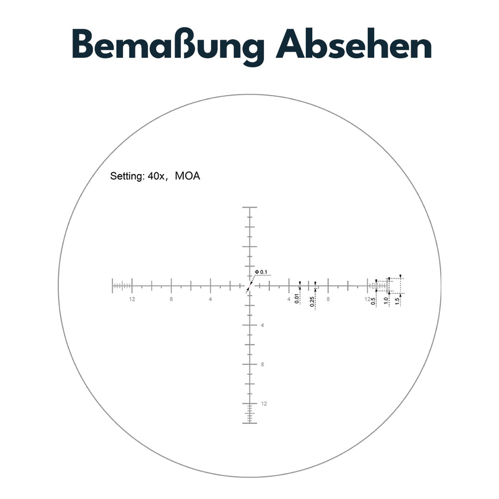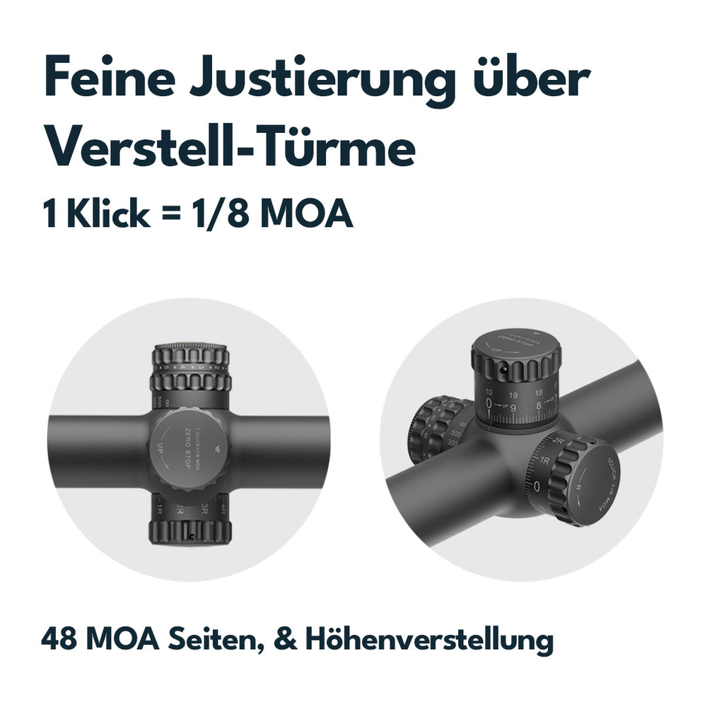 Zu den bemerkenswertesten Eigenschaften dieses Zielfernrohrs gehören das beleuchtete Absehen mit 6 Stufen welches der Umgebungshelligkeit angepasst werden kann um das Ziel schnell zu erfassen und die feine Verstellung in 1/10MIL Schritten. Dies ermöglicht eine bessere Sichtbarkeit des Absehens bei schlechten Lichtverhältnissen oder in der Dämmerung und eine feine Anpassung der Zielgenauigkeit um das Zielfernrohr optimal in Ihre individuellen Bedürfnisse und Schießbedingungen anzupassen.