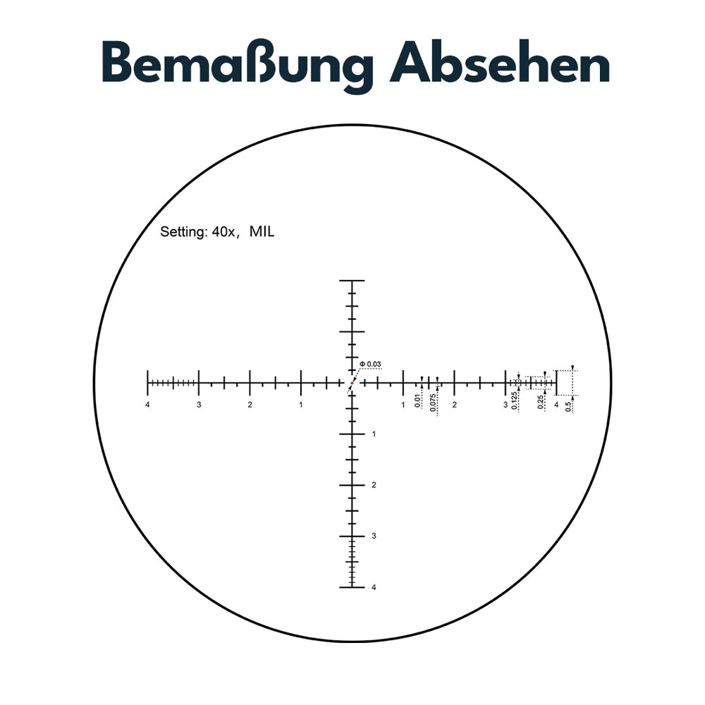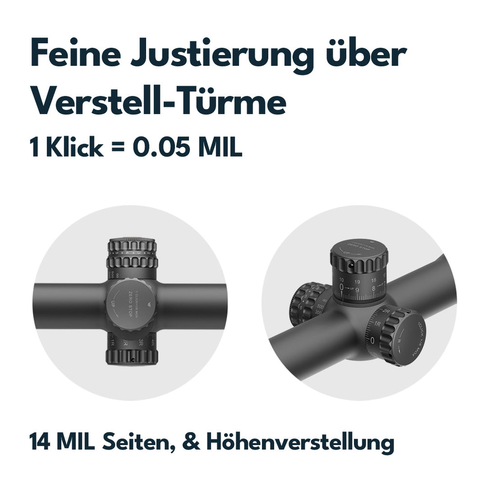 Zu den bemerkenswertesten Eigenschaften dieses Zielfernrohrs gehören das beleuchtete Absehen mit 11 Stufen welches der Umgebungshelligkeit angepasst werden kann um das Ziel schnell zu erfassen und die feine Verstellung in 1/10MIL Schritten. Dies ermöglicht eine bessere Sichtbarkeit des Absehens bei schlechten Lichtverhältnissen oder in der Dämmerung und eine feine Anpassung der Zielgenauigkeit um das Zielfernrohr optimal in Ihre individuellen Bedürfnisse und Schießbedingungen anzupassen.