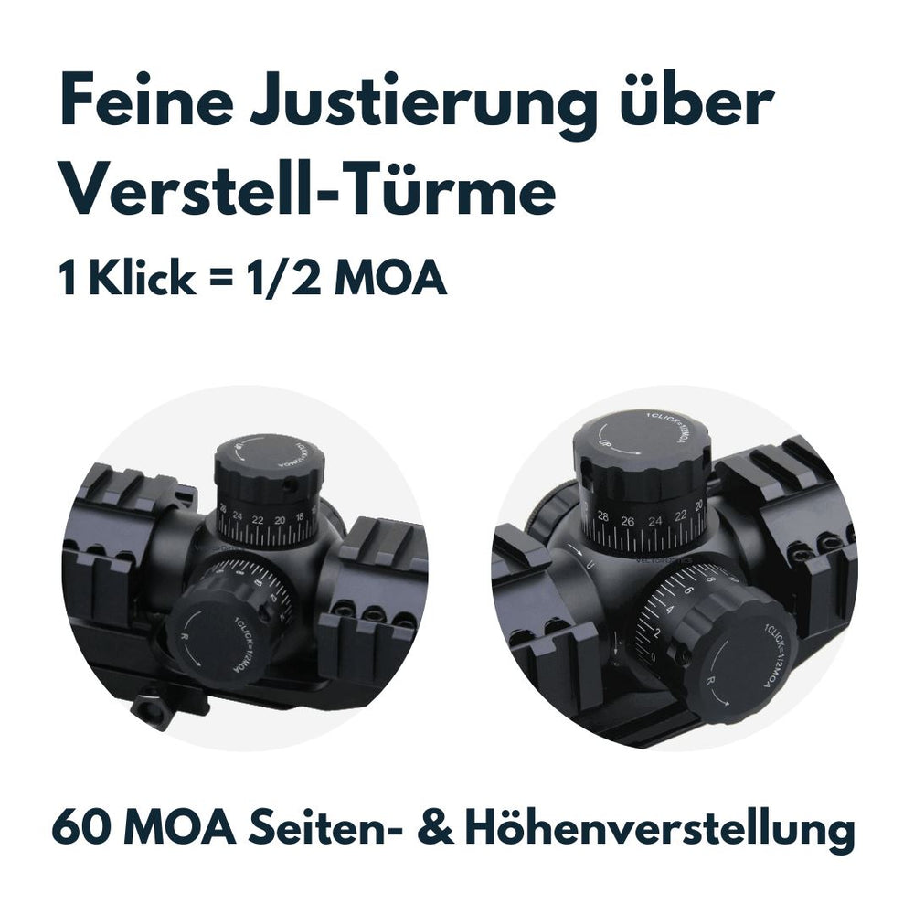 - beleuchtetes Absehen in Rot, 6 Stäken einstellbar