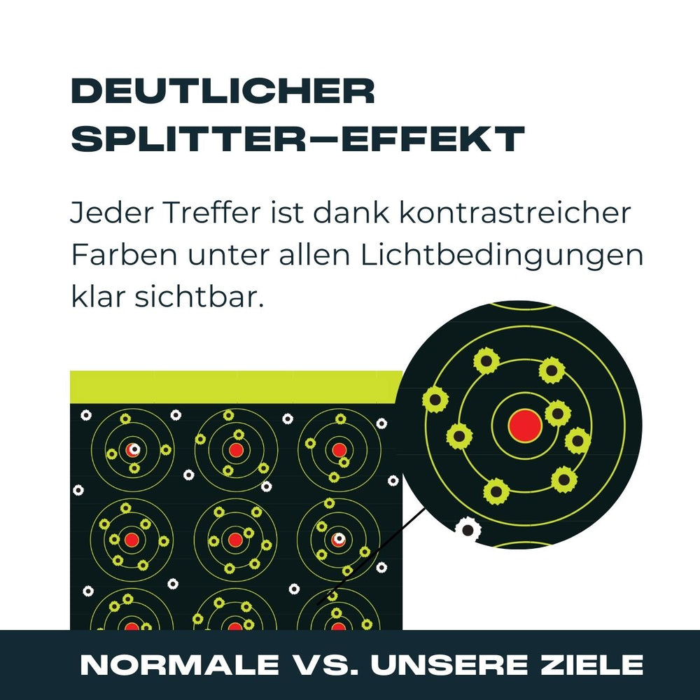 Hergestellt aus widerstandsfähigem 10pt-Karton, bieten die Zielscheiben eine hohe Stabilität und sitzen zuverlässig in allen gängigen Zielhalterungen. Das robuste Material minimiert Verformungen und gewährleistet eine lange Lebensdauer, auch bei intensivem Training. Der starke Farbkontrast aus Schwarz, Rot und Neongelb hebt Treffer deutlich hervor und ermögliche ein präzises, effizientes Training - ob mit Pistole, Gewehr oder Airsoft.