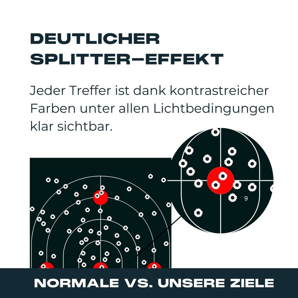 Die Vector Optics Splatter Targets sorgen für eine sofortige und klare Trefferanzeige bei jedem Schuss. Der integrierte Splatter-Effekt macht Einschläge unmittelbar deutlich sichtbar - selbst auf größere Distanzen oder bei schwierigen Lichtverhältnissen. So lässt sich die eigene Schussleistung direkt beurteilen und korrigieren, ohne Zielwechsel oder zusätzliche Optik wie ein Spektiv.