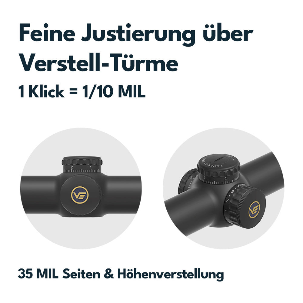 Zu den bemerkenswertesten Eigenschaften dieses Zielfernrohrs gehören das beleuchtete Absehen mit 11 Stufen welches der Umgebungshelligkeit angepasst werden kann um das Ziel schnell zu erfassen und die feine Verstellung in 1/10MIL Schritten. Dies ermöglicht eine bessere Sichtbarkeit des Absehens bei schlechten Lichtverhältnissen oder in der Dämmerung und eine feine Anpassung der Zielgenauigkeit um das Zielfernrohr optimal in Ihre individuellen Bedürfnisse und Schießbedingungen anzupassen.